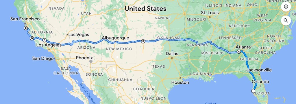 I left in a hurry. Four weeks to go on my work contract and an itch to get on the road. Friday morning I loaded the car in St. Petersburg, Florida, drove to a lunch meeting (nowadays, a rare and welcome event), and then kept driving. I reached California two days later.