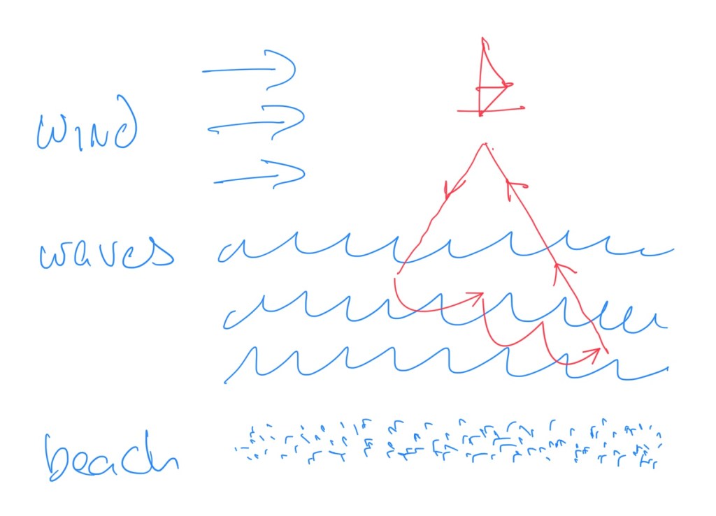 Not in the right direction and the poor windsurfer can’t ride the waves effectively, because she’s surfing wrong-footed (which is like writing with your other hand) or all twisted up to catch the wind.