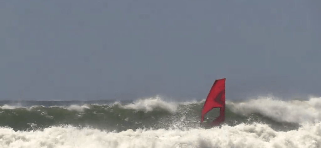 The wind hit me like a truck. It was brutally strong. You couldn’t tell from the beach or from the state of the sea because the wind was basically blowing from land over the beach. And the wind was incredibly variable, alternating violent gusts with brief periods of nothing. Gustiness is usual for offshore winds, but this was like nothing I’d ever experienced. I was either holding on for dear life or balancing precariously to stay afloat. Unprepared, I fell in a few times before I even made it to the wave, which duly smacked me down.